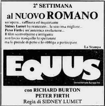 Nel 1977 il regista americano chiama Richard Burton per interpretare il ruolo del dottor Martin, essendo stato, lo stesso attore inglese, interprete della versione teatrale. I tempi sono dilatati, lunghi, i dialoghi hanno il sopravvento su tutto. Ma Equus è un film, non un’opera teatrale, e ovviamente mancano i tempi, il ritmo. Bene Colin Blakely e la bella e brava Jenny Agutter, che interpreta Jill, la causa scatenante della pazzia momentanea di Alan.